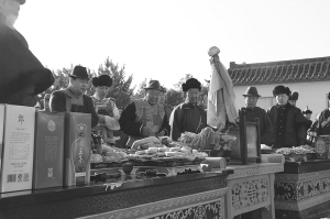 白酒、點心、干果,長長的條案上,擺放著各式祭品