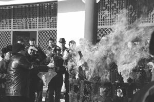 在主祭者的帶領下,男人們排隊走到火壇旁,一邊把自己帶來的白酒、黃油、羊肉等物恭敬地拋入火中,一邊禱告。按照傳統(tǒng),女人們在所有程序都告一段落時,最后走到火壇邊祭拜火神,祈福新春。