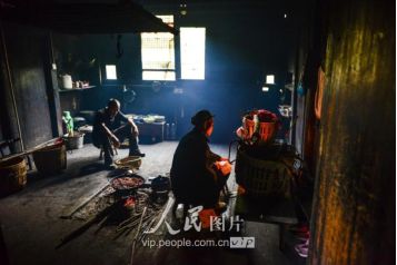 一般要到快過春節(jié)的時候,男方家才專門請人去接女方來洗糯米、打糍粑,新娘方能在夫家住上一夜;在來年農(nóng)忙時節(jié),又接女方來幫忙,夜里仍不能在男方家留宿,幫完忙當(dāng)晚即回去,只有待到女方有身孕后,新娘才到夫家長住。圖為11月16日夜,新娘潘芝銀家為準(zhǔn)備婚禮,燈火徹夜長明。
