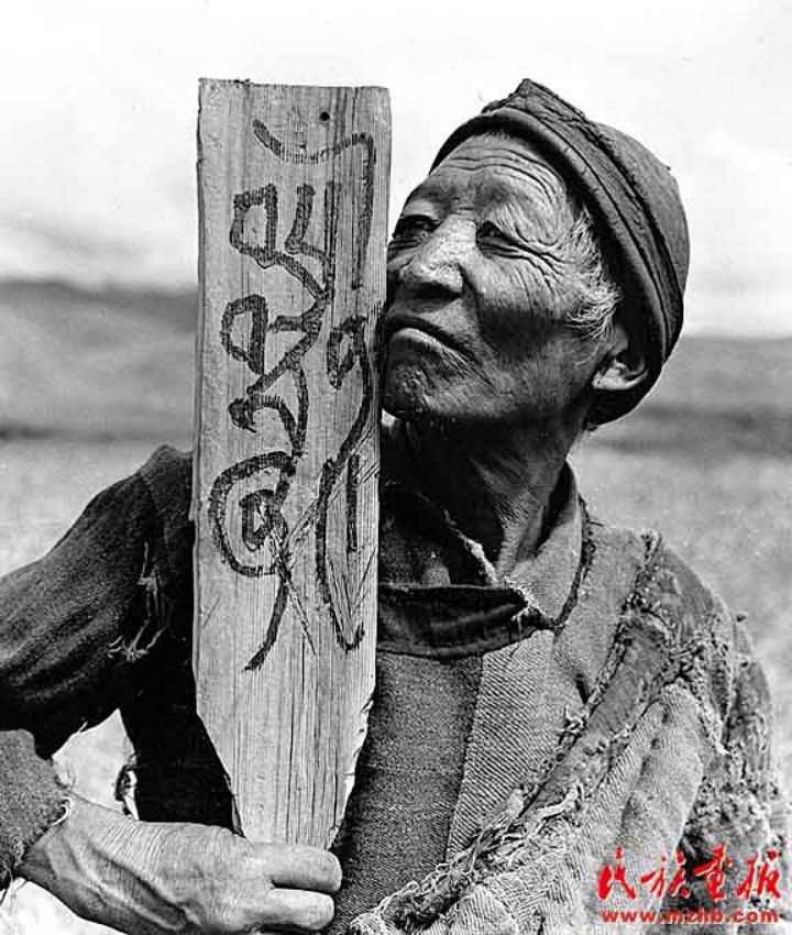 1959年,翻身的農(nóng)奴第一次擁有自己的土地,桑登手里拿著寫有“桑登的土地”的木牌久久不愿放下(藍(lán)志貴 攝影)