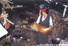 門巴族婦女在用羊皮囊提煉酥油