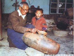 藏族老人用古老的陶器提練酥油