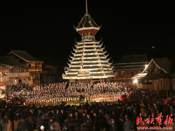 后來,鼓樓功能逐漸擴(kuò)大,不僅有擊鼓報(bào)信,召集族人議事的場(chǎng)所功能,還成為村寨的娛樂休閑中心。鼓樓在侗語叫“百”,意為“扎堆”、“聚集”。農(nóng)閑時(shí)節(jié)或耕作之余,人們來到鼓樓下聊天、唱歌、講故事。每逢喜慶節(jié)日,盛裝的侗家人就會(huì)在鼓樓坪歡聚一堂,吹蘆笙、踩歌堂,演侗戲,年輕人甚至利用這個(gè)場(chǎng)所對(duì)歌敘情、談情說愛。正如侗族民歌中所唱“鼓樓是村寨的暖和窩,沒有鼓樓無處尋歡樂,高高的杉木豎起鼓樓來,有了聚集的地方有了歡樂的歌”,這些正是對(duì)鼓樓功能擴(kuò)大的最好佐證。