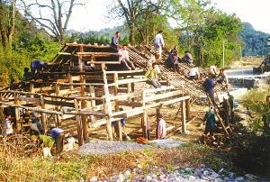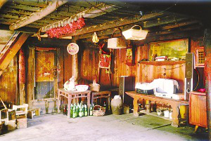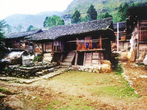 筆者看到的干欄式木樓和吊腳樓在使用的功能上相差無幾,上層住人待客,樓下四壁用木板圍擋,圈養(yǎng)畜禽,存放燒柴、農(nóng)具和秋收臨時堆放的糧食。豬圈靠里側依柱圍欄,其它空閑的地方打掃得干干凈凈,有的將織布機放在樓下明亮的地方。住房一般5間,兩頭兩間是偏廈,中間3間是寬敞的堂屋,一頭設火塘、土灶,為烤火、煮飯之處;另一頭的中柱供臨時設席敬神之用,也有的在板墻上設佛龕神位,供奉祖先;臥室依房柱用木板靈活隔間。大門有的開在房山墻一側,也有開在中間的,皆登石階、板梯而上。吊腳樓一棟挨著一棟,小巷道曲折狹窄,只容牽牛和順向挑擔通過。