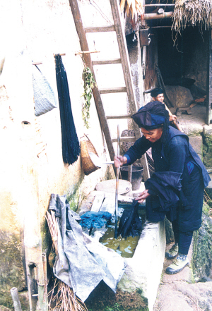 紡紗、織布、藍染,是哈尼族婦女制作服裝的重要組成部分。她們在織布前要做的準備工作,就是操動制線機,把一根根短小的線連接起來,捲在小木棍上,然后操動絞線機,把線棍上的線分開絞在木梭子和木輪子上。接著是分線,人數(shù)不限,但不能少于5人,一般10米為一組線。織布時,在織布機上方搭起兩排密集的線網(wǎng),當雙腳踩動踏板時,兩排線網(wǎng)一上一下地交叉移動,將拖著線的梭子一次次地左右穿梭于線網(wǎng)中。這樣重復地進行,就織出一筒筒布,一般10米為一筒布。最后把織成的布放入靛缸里泡洗,曬干后就可以制作服裝了。