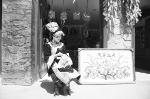 午后,張國麗文文靜靜地坐在店前刺繡,繡帕上是一對鮮活的鴦鴦?!盀t灑、飄逸、俊秀是張國麗刺繡創(chuàng)作的風(fēng)格,許多來旅游的人都是這樣評價的。她獨樹一幟,盡情彰顯了羌風(fēng)羌韻?!痹樠鄧烂C認真地解說。