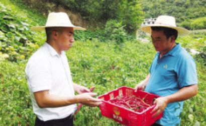 石通佾(左)與場河村村民石佩發(fā)(右)交流辣椒收成情況。馬永攝