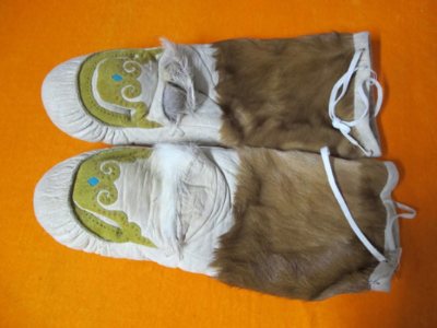 此外鄂倫春人還有被稱為“瓦拉開(kāi)依”的手套,它和北方人做的棉手悶子一樣,是拇指同其他四指分開(kāi)的手套,手心處無(wú)開(kāi)口,戴這種手套可以保暖,也可以拿比較笨重粗大的東西,但不能射獵。另一種被稱為“沙拉耶開(kāi)依”,是五指手套,即五指分開(kāi),戴這種手套拿東西或射擊都很方便,但保暖性能差,多為青年人喜愛(ài)和佩戴。鄂倫春人冬季出獵,一般還是喜歡戴“考胡魯”。以上三種手套多用狍皮制作,五指分開(kāi)的手套也有用鹿皮制作的。
