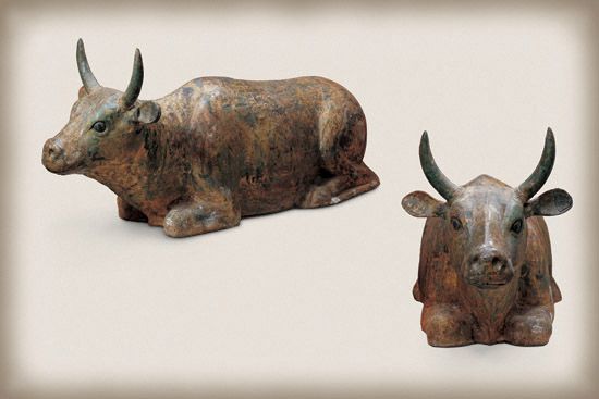 青銅鑄造,中空,外表通體鎏金。牛屈肢而臥,雙眸遠眺,四肢有力,體態(tài)健壯,比例勻稱,線條流暢,造型形象逼真,個體碩大。該銅牛制作時需要將冶煉、模具雕塑、澆鑄、拋光和鎏金等工藝集于一體,真實地反映出西夏青銅鑄造工藝的高超水平,是西夏金屬工藝品的杰出代表。