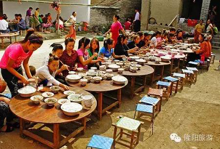 男方家也得請(qǐng)客。新郎啟程去接新娘子,家里馬上就殺雞做飯,新郎新娘回來(lái)后要吃染成黃色的糯米飯和雞肉,表示往后生活美滿幸福,像糯米飯一樣結(jié)成團(tuán)永不分開。晌午時(shí)分,是新郎家待客最熱鬧的時(shí)候,幫廚的人擺上各種酒菜,親朋寨鄰老老少少全坐到天井里,歡歡鬧鬧地吃飯。最后,客人們有的陸續(xù)走了,愿留下的湊攏幾桌,邊喝酒邊暢談,一直要吃到第二日還不歇。