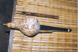 阿昌族的樂器主要有竹琴、洞簫、葫蘆簫(右圖,劉軍攝)、三月簫、銅口弦、三弦、象腳鼓(下圖,蒙哥提供)、铓鑼等。葫蘆簫是用葫蘆連接三根竹管制成的,它有7個音,音量小,音調低緩圓潤,一般晚上用。三月簫用一根竹管制成,也有7個音,它的音量大,音色細亮,多在白天使用。葫蘆簫和三月簫不僅是阿昌族人民心愛的傳統(tǒng)樂器,還是男女青年傳情示愛的媒介。