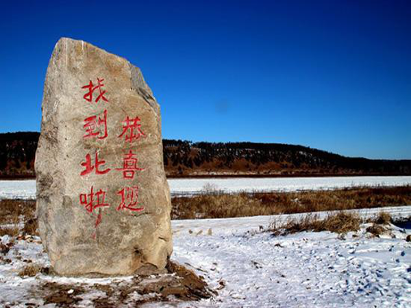 沿著形態(tài)各異的“北”字,可以走到中國最北端的廣場(chǎng)——北望埡口。“東經(jīng)122°20'43。48〃E北緯53°29'52。28〃N”的標(biāo)志就立在這里,旁邊一塊巨石上刻著“中國北極點(diǎn)”。