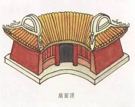 扇面頂和萬字頂一樣,是一種非常別致的屋頂形式,扇面頂顧名思義,就是扇面形狀的屋頂形式,其最大特點就是前后檐線呈弧形,弧線一般是前短后長,即建筑的后檐大于前檐。建筑的西山墻的墻線若向內(nèi)延伸,可以交于一點,而這一點就是扇形的扇子柄端。扇面頂?shù)膬啥丝梢宰龀尚健疑?,也可做成卷棚形式。扇面頂一般都用在形體較小的建筑中,會讓建筑看起來更為小巧可愛。