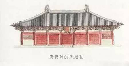 根據(jù)資料與記載,廡殿頂屋頂早在殷商時代就已出現(xiàn)。不過,現(xiàn)在對唐代中期以前的廡殿式屋頂?shù)木唧w結(jié)構(gòu)已無從得知,晚唐以后漸有實例可查。其形象是屋面平緩,正脊較短。正脊兩端為鴟尾而不是鴟首。