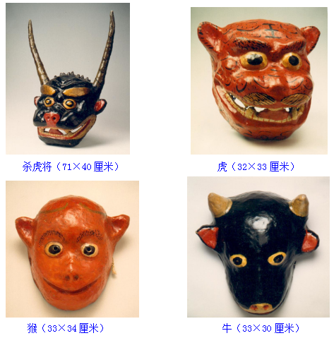 面具,土族語稱“面古子”,是土族在表演某些儀式舞蹈時(shí)用以表現(xiàn)一定內(nèi)涵的道具。按形制可分為假面和假頭兩大類。其中最具代表性的當(dāng)屬“納頓”節(jié)日當(dāng)中使用的面具。民族文化宮博物館珍藏了三組土族“納頓”面具,分別為表演“莊稼其”時(shí)的公公、婆婆、兒子、媳婦的假面面具;表演“殺虎將”時(shí)的殺虎將、虎、猴、牛的假面、假頭面具;表演三國(guó)演義人物關(guān)羽、張飛、曹操、呂布的假面面具。面具材質(zhì)均為布胎, 20世紀(jì)80年代征集于青海省海東市民和回族土族自治縣。