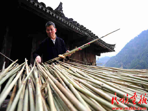 莫師傅在對(duì)兩個(gè)蘆笙進(jìn)行高低音的和諧調(diào)試