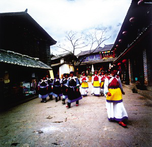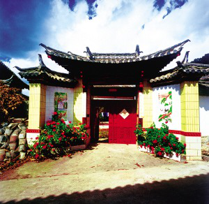 束河、沙河古村鎮(zhèn)到處都是納西族的田園式庭院。大門的裝飾與圍墻和屋脊的裝飾相呼應(yīng),庭院里種了許多植物,高的果樹(shù),矮的花草,就像一個(gè)小花園,和田間彌漫著的野薔薇都散發(fā)著令人陶醉的幽香。