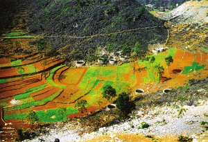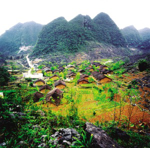 廣西百色地區(qū)那坡縣村落。村寨多隨地形與山勢(shì),布局自由分散,既不存在縱橫軸線,也沒有明顯的村寨邊界。受地形影響,村寨規(guī)模一般不大