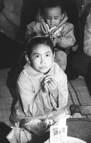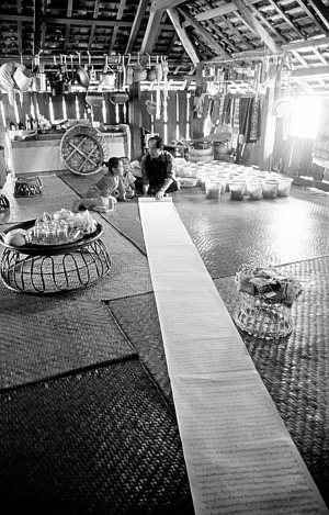 這時,走來一個大佛爺和兩個老人,因為佛祖不會開口說話,他們是來替佛祖給玉波念“薩拉帥”祝詞的。先由大佛爺念了一段《祝福經(jīng)》,給玉波滴了水,然后兩個老人打開玉波那寬半尺、長足有7米多的“薩拉帥”祝詞。玉金說,這祝詞是請曼降村的前大佛爺康朗寫的(康朗:指佛爺還俗的人)。來倆個老人念,是考慮到可以換著念。玉波的奶奶也想到了玉波可能跪不習(xí)慣,就帶來了墊子,讓玉波或跪或坐,因為念完祝詞要兩三個小時。祝詞的內(nèi)容大致是這樣的:“我是一個在菩提樹下長大的女孩,在佛祖的護蔭下,臉長得像菩提樹葉一樣又嫩又青,身材像檳榔樹一樣苗條好看,心像金鹿一樣善良。當我年滿12歲以后,人世間的喜樂情愛,貧窮苦難就會來到我的面前。今天在父母的幫助下,我準備了這些物品來賧給佛祖。我千祈禱萬祈求,希望佛祖保佑我織布是行家,丈夫種田是能手。命里見火能親,遇水能溶。生的孩子女的長得像一只蜜蜂,男的長得像一頭水牛,用他們的勤勞贍養(yǎng)雙親。從小就聽話,自幼就很乖。在母親的懷里不亂哭,在父親的背上不亂搓……”