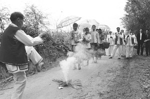 第二天一早,八音隊在前面邊走邊吹長調(diào)曲,由8人組成的迎親隊伍一路歡歌笑語地來到新娘家村口。八音隊要猛吹迎親曲,新娘家的人才出來迎接。這時,村里的一位長者拿著一把稻草、少許米飯、一個雞蛋,從村子走出來并緩緩點燃稻草,一邊念咒語,一邊向火堆拋雞蛋。然后,迎親隊伍走過火堆才能進(jìn)村。