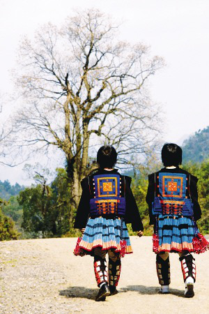 白褲瑤女人身上最惹眼的,除了百褶裙,還有她們衣服背后那一個(gè)個(gè)大大的方形圖案。傳說900年前,白褲瑤首領(lǐng)有一方皇帝賜給的權(quán)印,被女婿以哄孫子為借口,借走并用假印調(diào)了包,瑤族人因此被趕進(jìn)山里,過起了少田缺水的游耕生活。為了告誡子孫不要忘記因?yàn)閱适?quán)力而導(dǎo)致苦難的教訓(xùn),從此,白褲瑤就在女人的馬鞍衣后面,繡上了一個(gè)形狀像首領(lǐng)印一樣的彩色方塊圖案。這是一種紀(jì)念,也是一種懷念。裙擺拂過落葉,一如群蝶穿越花叢。