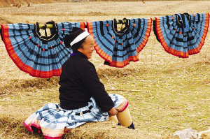 白褲瑤女人體態(tài)婀娜。這婀娜既來自于她們風(fēng)擺楊柳般的百褶裙,也來自身上前后兩片的夏衣。夏衣,黑色的調(diào)子,沒領(lǐng),沒袖,前面是一塊和肩膀?qū)挾认嗟鹊恼叫嗡夭?,后面則是用蠶絲布來制作的裙邊土布,上面繪滿了蠟染和花繡圖案。用漿染土布縫制成的百褶裙上,布滿了手繪而成的彩色圖案。其最復(fù)雜的工序,一是借粘膏樹汁憑空勾畫,二是用花線依著粘膏樹汁描過的隱約印痕,一點(diǎn)一點(diǎn)地挑繡出彩色圖紋來。做好一條裙子,往往需要花上女人們半年的時(shí)間。