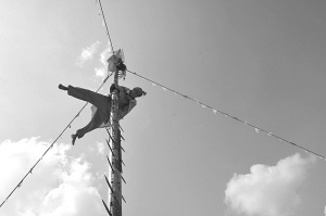 眾目睽睽下,徒弟們不敢丟臉,雖然內(nèi)心恐懼,但只能強(qiáng)裝鎮(zhèn)定。符長洪的兒子、大徒弟符振德,慢慢地沿著刀梯挪向梯沿。他用手使勁攥住梯沿,單腳慢慢地踩上刀刃,試了試,安全,就將另一只腳也放上去。不一會(huì)兒,符振德順利地走下了刀梯。腳一沾地,他便樂開了花:“我成功了!”其他幾個(gè)徒弟也效仿符振德的做法,第一次完成了“上刀梯”的表演。