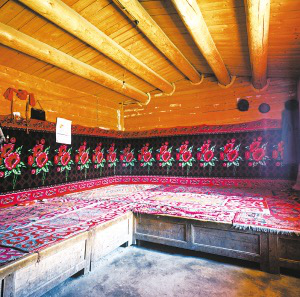 聚居新疆維吾爾自治區(qū)昌吉回族自治州奇臺(tái)縣大黑溝村農(nóng)牧區(qū)的塔塔爾族有兩種住房。一種是厚木板做墻壁的木刻楞房,另一種是平頂土房。木刻楞房建在平整的土臺(tái)上,房前設(shè)立木柱成廊道,只在前面設(shè)玻璃窗。板壁直角切半榫頭相搭,涂紅油漆。棚頂以粗大木檁密搭于板壁上,形成緩斜坡,不用椽子,直接以木板蓋頂。室內(nèi)彌漫著淡淡的松香味,以木板搭炕,中間立一細(xì)木柱,板炕上鋪花氈,被褥疊在墻角,墻邊立幾個(gè)靠墊,使坐靠更舒適。進(jìn)門(mén)正廳隔出的一小間,是方便老人起居生活的臥室。