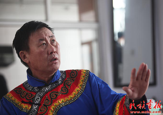 國家級非物質(zhì)文化遺產(chǎn)項目赫哲族“伊瑪堪”代表性傳承人吳寶臣演唱“伊瑪堪”(袁東平 攝影)