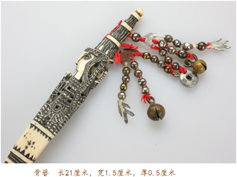 骨簪頭部以下是充滿幾何感的水波紋、山形紋、米字紋、圓形紋,留白之處有魚紋、花紋以及少許文字。文字或是雕刻者本人,或是其心愛之人。一般頭像處或中部系有幾束彩色料珠的紅纓穗飾物用以盤繞發(fā)髻上,或是以銀鈴、銀片來裝飾。