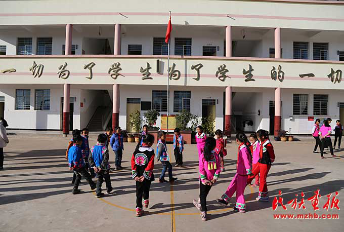 看過(guò)臘灣民族小學(xué)課間操的人都會(huì)說(shuō):“臘灣民族小學(xué)的課間操都是跳出來(lái)的?!比欢瑢?duì)于這所雙語(yǔ)教學(xué)的民族小學(xué)來(lái)說(shuō),其民族特色遠(yuǎn)不止于此。穿彝族傳統(tǒng)服裝、講彝語(yǔ)也是這里的教育特色。