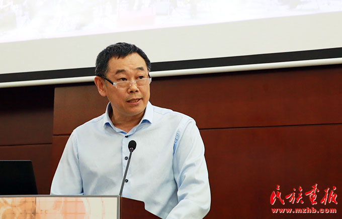 中國(guó)少數(shù)民族電影工程領(lǐng)導(dǎo)小組辦公室副主任、宣傳推廣部主任,中國(guó)民族影視研究中心主任牛頌主持研討會(huì)