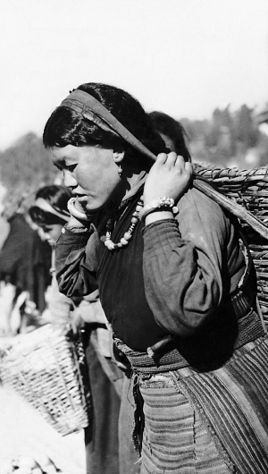 背著馱籃的女人。