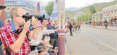 外國游客拍攝街頭巡游的馬術(shù)方隊