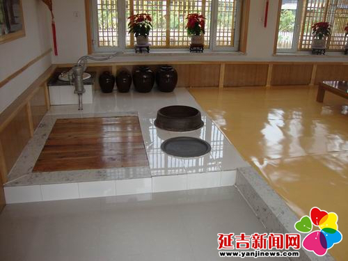 在傳統(tǒng)的朝鮮族民宅中,炕和鍋臺是平齊的,需要燒火做飯時,主婦會打開架在柜臺一側(cè)的移動木板,下到地面水平線以下的“灶坑”點(diǎn)火做飯。傳統(tǒng)的炕采用長筒式結(jié)構(gòu),煙火由一洞內(nèi)循環(huán)排出,使每洞都有煙火串入,炕即溫?zé)?。朝鮮族的火坑高度為30-40厘米,但炕洞向下挖入,炕面抹白灰,表面糊油紙或鋪草簾子,炕面平整。隨著物質(zhì)條件的改善,炕面改鋪纖維板或者地板膠,既美觀又耐用。