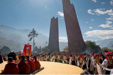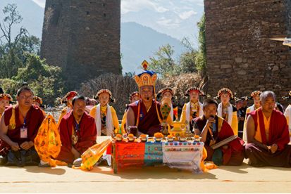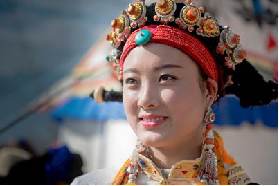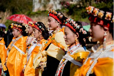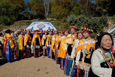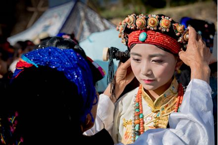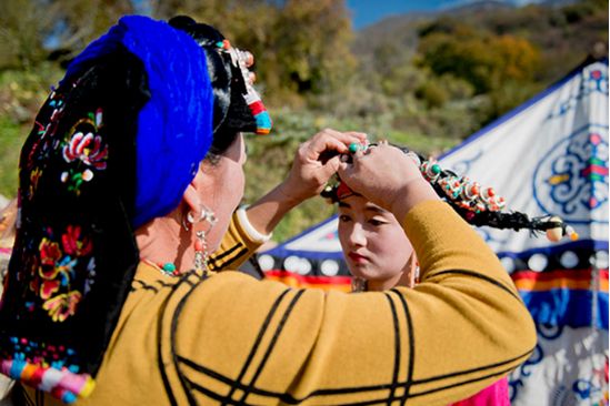 盤好發(fā)髻,佩戴好頭飾,在肩、背系好五彩哈達(dá)后,由本村具有威望的女性長(zhǎng)者引領(lǐng)來到儀式現(xiàn)場(chǎng)。法號(hào)聲中,煨桑的青煙裊裊升起,威嚴(yán)的活佛主持誦經(jīng)祈福儀式。隨后,德高望重的長(zhǎng)者為參加儀式的女子送祝福茶,長(zhǎng)輩為姑娘們獻(xiàn)哈達(dá)。一系列儀式結(jié)束后,無論男女老少,都來到場(chǎng)地中央,踏歌起舞,跳起吉祥的鍋莊。