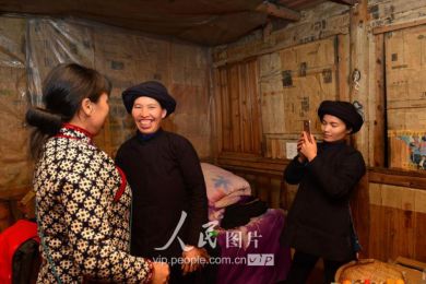 一般要到快過春節(jié)的時(shí)候,男方家才專門請(qǐng)人去接女方來洗糯米、打糍粑,新娘方能在夫家住上一夜;在來年農(nóng)忙時(shí)節(jié),又接女方來幫忙,夜里仍不能在男方家留宿,幫完忙當(dāng)晚即回去,只有待到女方有身孕后,新娘才到夫家長住。圖為11月16日夜,新娘潘芝銀家為準(zhǔn)備婚禮,燈火徹夜長明。