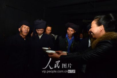 11月16日,新郎家派來的“關(guān)親客”在與新娘家的親戚喝酒對(duì)歌。