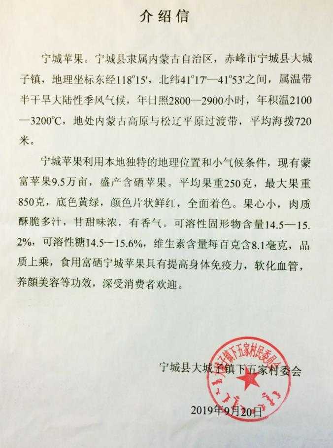 寧城蘋果是寧城縣巴林果樹試驗場與沈陽農(nóng)業(yè)大學(xué)合作,于1978年以哈爾濱東光蘋果為母本和日本富士蘋果為父本雜交而來,經(jīng)過十幾年時間選育而成的蘋果。1997年內(nèi)蒙古自治區(qū)科學(xué)委員會組織國內(nèi)著名果樹專家進行鑒定,定名為蒙富,寓意內(nèi)蒙古的富士。2015年7月“寧城蘋果”通過國家工商總局商標局注冊,取得“寧城蘋果”地理標志證明商標,推動了本地蘋果產(chǎn)業(yè)健康快速發(fā)展。