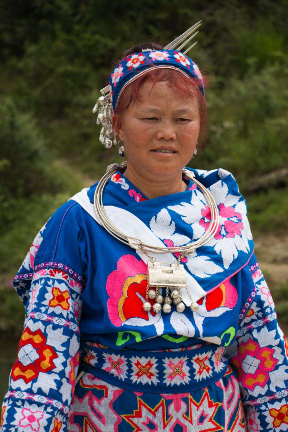 谷立村苗族女性服飾顏色花哨,款式新穎。女子一般頭戴絲帕裹成的帽子,帽子顏色主要為藍(lán)色,上面繡有花朵圖案作為裝飾。頭飾除了戴帽子,還佩戴有銀飾發(fā)簪,發(fā)簪數(shù)量一般為4根,發(fā)簪底部焊接有銀鈴鐺作為裝飾。上身主要穿著藍(lán)色打底的翻領(lǐng)長袖上衣,衣服上有大面積刺繡圖案,刺繡圖案內(nèi)容豐富,兩袖同樣也有大面積刺繡圖案,圖案以花草、幾何居多。女子胸前還佩戴有銀飾,銀飾主要為銀圈和銀鎖,在銀鎖下方還焊連有銀鐺作為裝飾。女子主要以藍(lán)色打底的百褶短裙和圍腰為主,百褶短裙上繡有花紋圖案作為裝飾。圍腰上的刺繡圖案面積大且內(nèi)容豐富,圖案整體成幾何狀,幾何圖案內(nèi)又繡有花草圖案,圍腰下部繡有花紋描邊和串有珠簾作為裝飾。女子在小腿處還綁有藍(lán)色打底的護(hù)腿套,護(hù)腿上繡有花朵圖案。