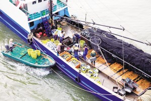 小快船靠上捕魚歸來的大漁船,收購、轉(zhuǎn)運(yùn)海鮮漁獲(2014年攝)。