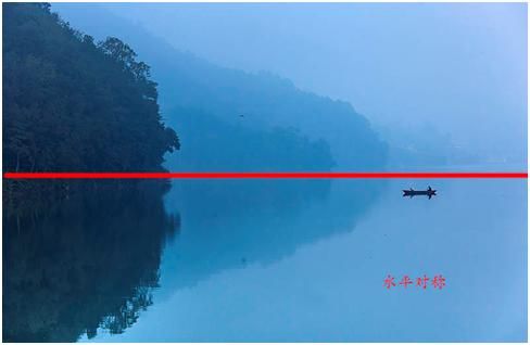 除了縱向?qū)ΨQ,還有水平對稱。水平對稱,一般適合拍攝上下對稱的題材,比如說水面的倒影。在太陽還沒出來的時候,已經(jīng)有亮光的時候,天空呈現(xiàn)出一種藍調(diào),水面又沒有高光,一切都是那么的寧靜,因為藍色是讓人很安靜的一種顏色,很舒服。如果你看到了這時候水面的景色,倒影還不錯的話,不妨采用這種方式。