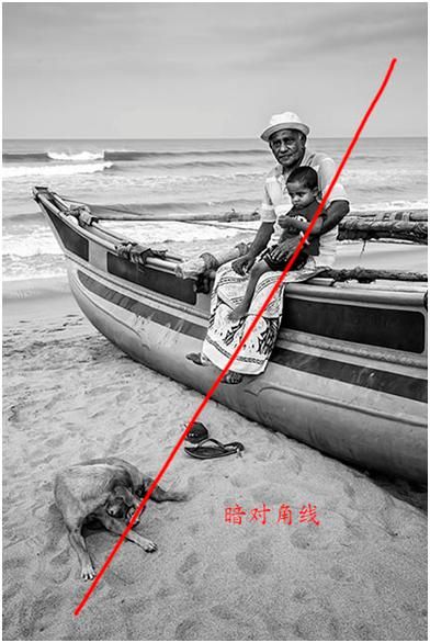 這個海邊老人跟狗之間也形成了暗對角線,包括下面的這個在拍照的人跟這個雕塑之間也形成了一個暗對角線,所以這個畫面非常平衡,不是一邊重一邊輕,而且不呆板。所以對角線這種形式非常實用。