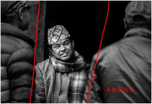 上面這兩張圖第一張,歸類為半包圍。第二張圖也是半包圍,在尼泊爾的一個小鎮(zhèn)拍的,旁邊兩個人是背影,實際上把這個人夾在中間,所以這個人特別容易引起你的注意,形成了一種包圍趨勢,在電影的鏡頭語言中運用的比較多。