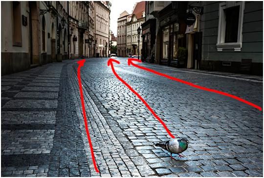 這張圖是布拉格阿的一個早晨,大概是早上五點多鐘,路上很安靜,天開始蒙蒙亮,我就拍了一張很安靜的街道,首先看到的興趣點是一只鴿子。路面形成的引導(dǎo)線以及通過路面反光形成的引導(dǎo)線來達到的,把目光從這只鴿子引向遠方。