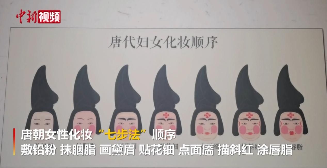 記者從展覽中的展板看到,唐朝女性化妝“七步法”順序:敷鉛粉、抹胭脂、畫(huà)黛眉、貼花鈿、點(diǎn)面靨、描斜紅、涂唇脂。