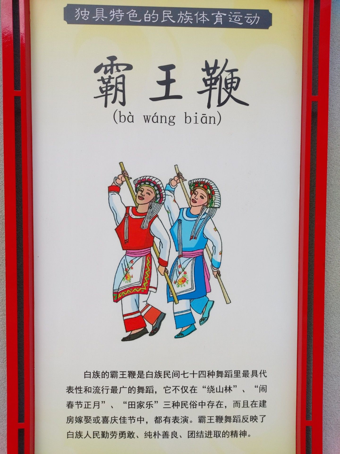 白族的霸王鞭是白族民間七十四種舞蹈里最具代表性和流行最廣的舞蹈,它不僅在“繞山林’”、“鬧春節(jié)正月”、“田家樂” 三種民俗中存在,而且在建房嫁娶或喜慶佳節(jié)中,都有表演。霸王鞭舞蹈反映了白族人民勤勞勇敢、純樸善良、團(tuán)結(jié)進(jìn)取的精神。