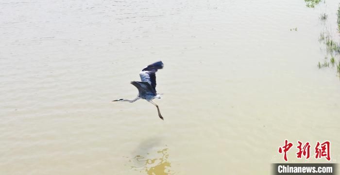 鳥兒在南宮湖濕地公園飛翔?!√锿z