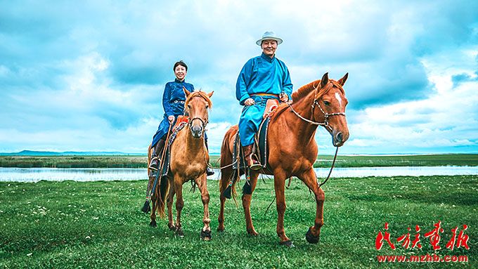 烏日根桑格與愛人薩日娜在牧區(qū)。
