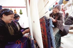 山南市瓊結(jié)縣農(nóng)牧民在襄陽援藏工作隊(duì)引進(jìn)的西藏薩喜欽布公司編織藏毯。 湖北省民宗委供圖